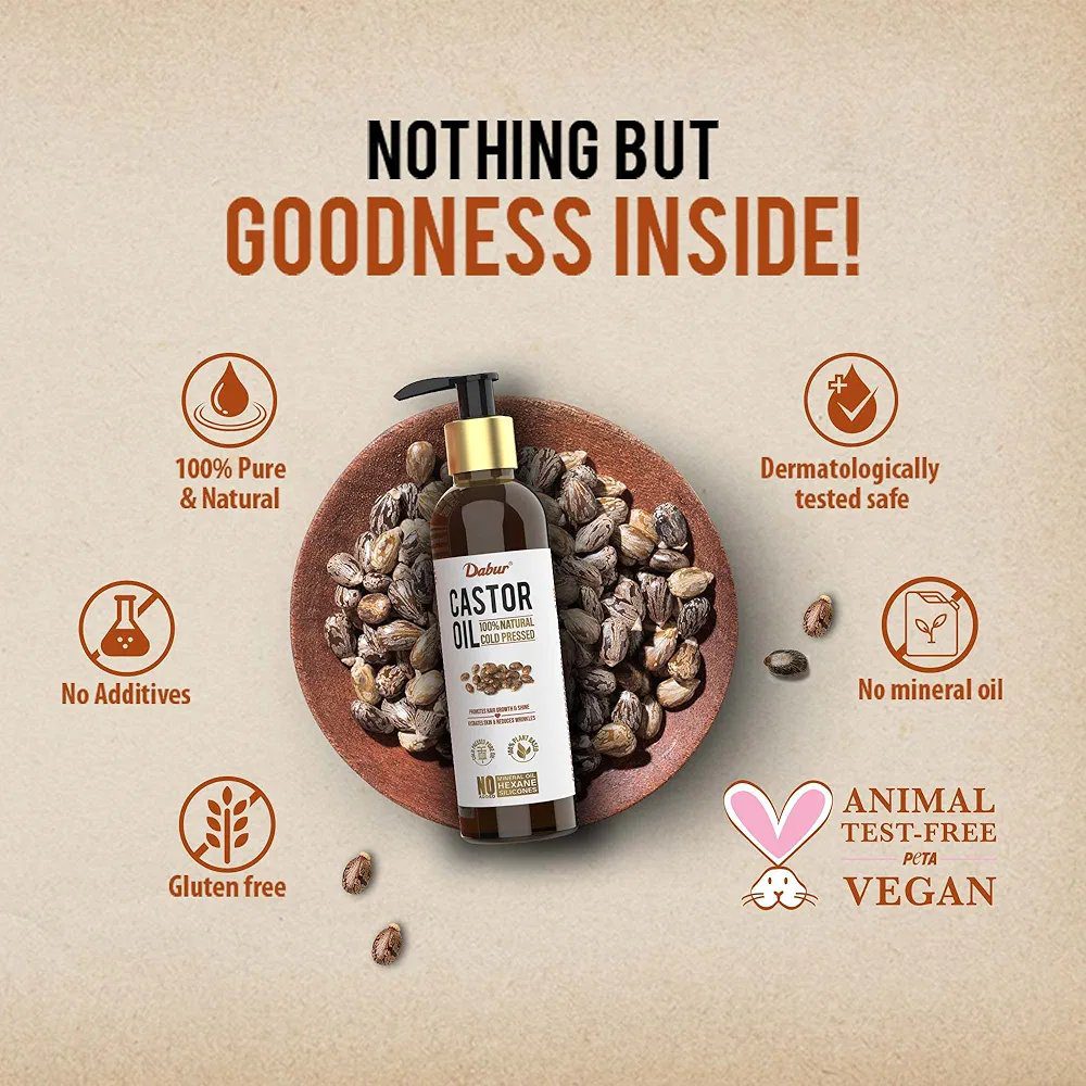 Dabur Castor Oil - 200ml | 100% Natural Cold Pressed Oil | Promotes Hair Growth, Hydrates Skin & Reduces Wrinkles | No Mineral Oil & Silicones
