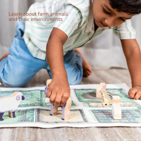 Wooden Farm Animals, Wooden Peg Dolls, Canvas Mat & Story Booklet