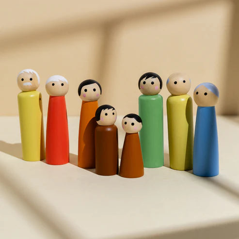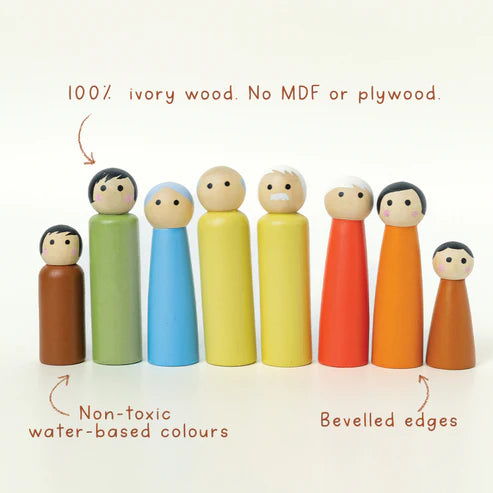 - A family of 8 wooden peg dolls - the perfect little farmers to care for the animals and bring the farm to life!