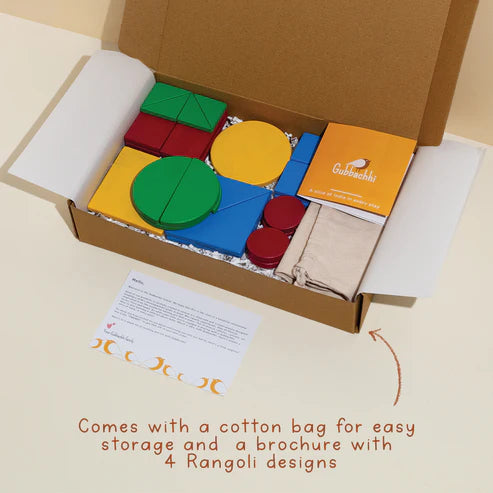 As children, we would all gingerly tiptoe around rangolis laid outside houses in our neighbourhood. Be it a simple white everyday chalk rangoli or the more elaborate festive ones, rangolis have been a quintessential part of Indian life. Inspired by these designs, we present to you our Rangoli Wooden Puzzle - that can be arranged into distinct Rangoli-inspired designs. There's also a brochure that outlines the various designs that can be made using this puzzle