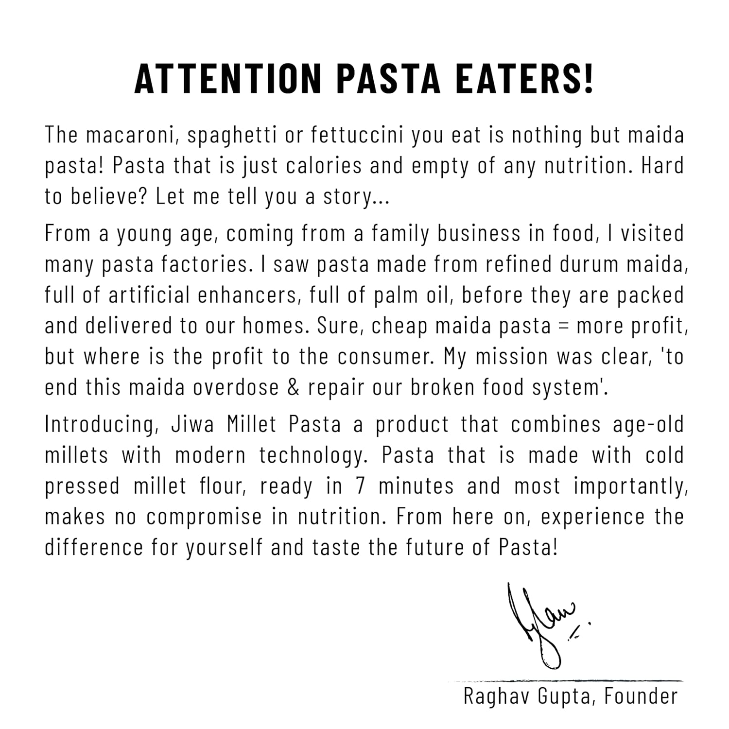 - Replacement to Regular Pasta - Our millet pasta cooks in 7 minutes and is a great replacement to any other maida, atta or rice pasta