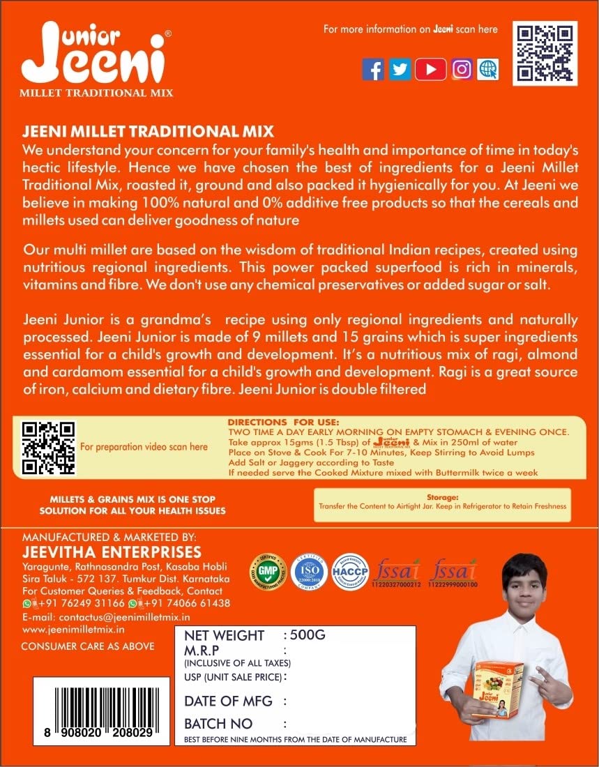 | Junior All Natural Multigrain | Organic and Natural Product . Junior Jeeni millet traditional mix is manufactured by understanding the concern for all families' health and the importance of time in today's hectic lifestyle. Hence we have chosen the best ingredients for traditional Juniour Jeeni Millet Health Mix, roasted in Clay pot and also packed hygienically for you. 100% natural and 0% additive-free product. This breakfast porridge is full of whole grains like Ragi, Brown Top Millet, Kodo Millet, Little Millet, Barnyard Millet, Perl Millet, Foxtail Millet, Proso Millet, Jower, Green Gram, Urad Dal, Soya Bean, Horse Gram, Ground Nut, Flax Seeds, Maize, Toor Dal, Black Pepper, Fenugreek, Barley, Red Rice, Bengal Gram, Junior Jeeni Millet Health Mix is food supplement. Junior Jeeni Millet Health Mix helps in brain development and physical development, increases red blood cells, fights anemia and fatigue, increases memory power, boosts immunity power and strength for sports activities