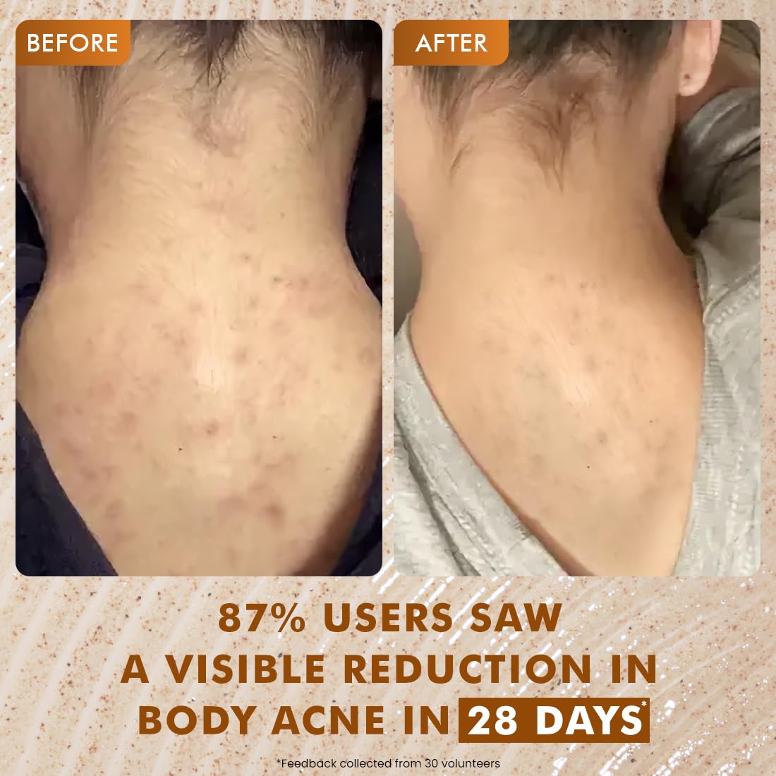 - CONSUMER STUDY RESULTS : 87% users saw a visible reduction in body acne in 28 days. *Feedback collected from 30 volunteers