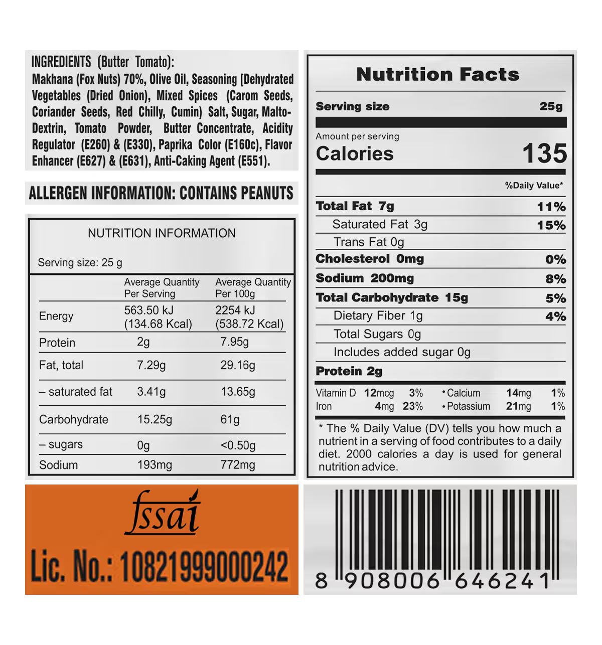 Makhana (Popped Lotus Seeds)70%, Olive Oil 18%, Spices & Condiments 10% (Red Chilli, Dried Onion Flakes, Corinder Seeds, Fennel, Black Pepper, Mace) Salt, Tomato Powder, Maltodextrin, Nausadar (Ammonium Chloride) (E510), Butter Concentrate, Acidity Regulator (Citric acid E330) & (Malic acid E296), Hydrolyse Peanut Protein, Colour (Paprika oleoresin E 160c), Flavour Enhancer (Disodium 5'- ribonucleotides E635)