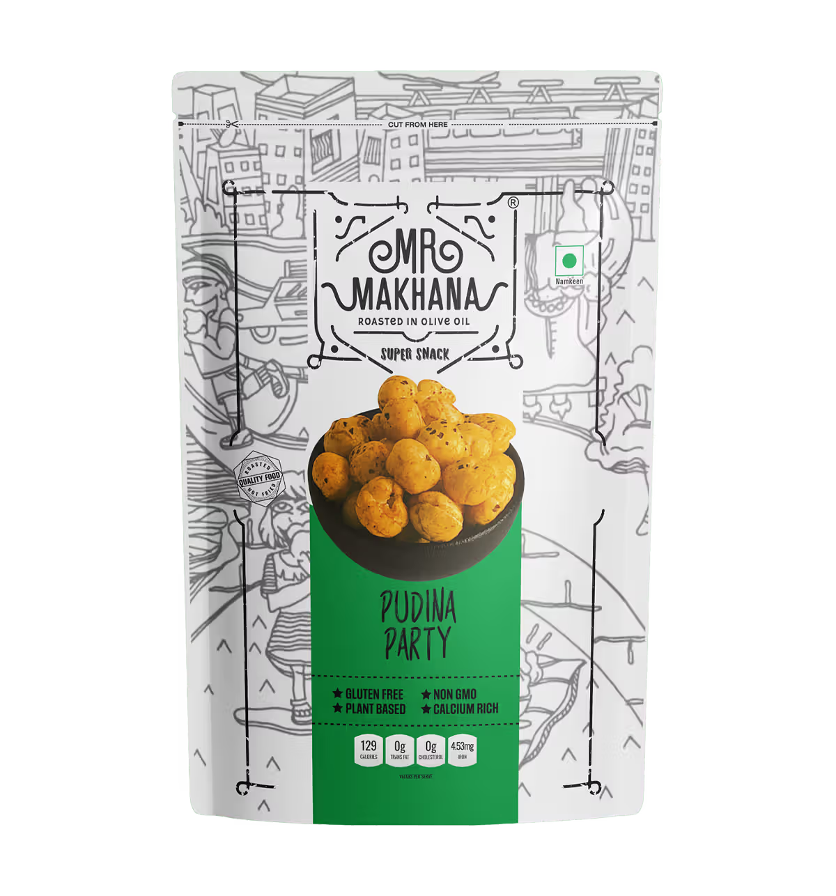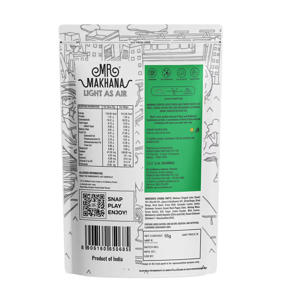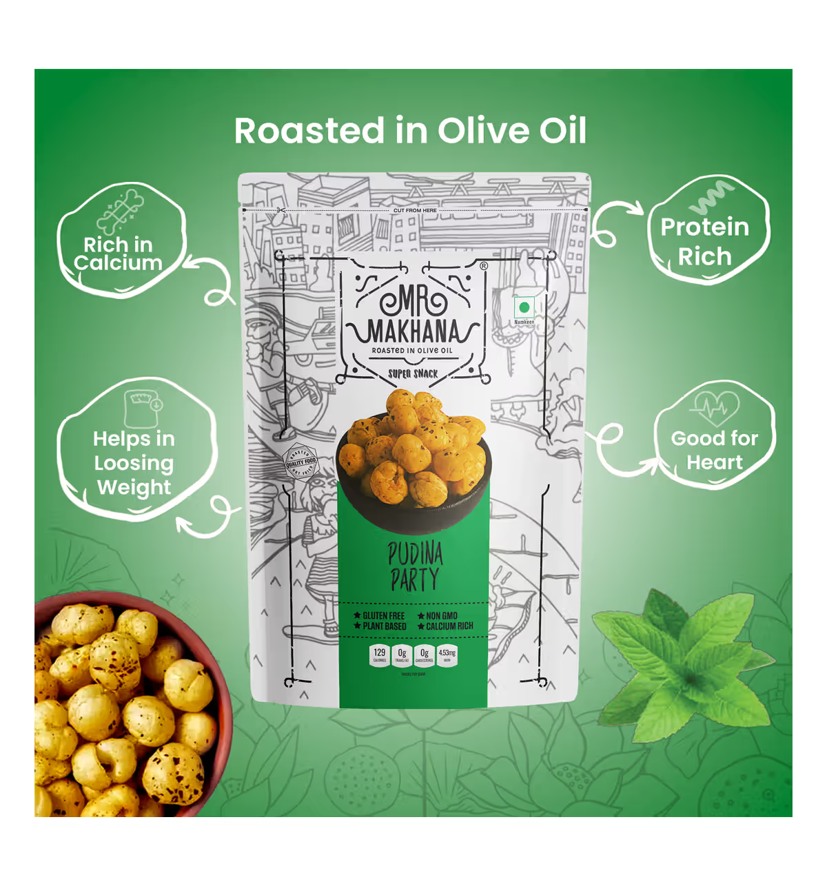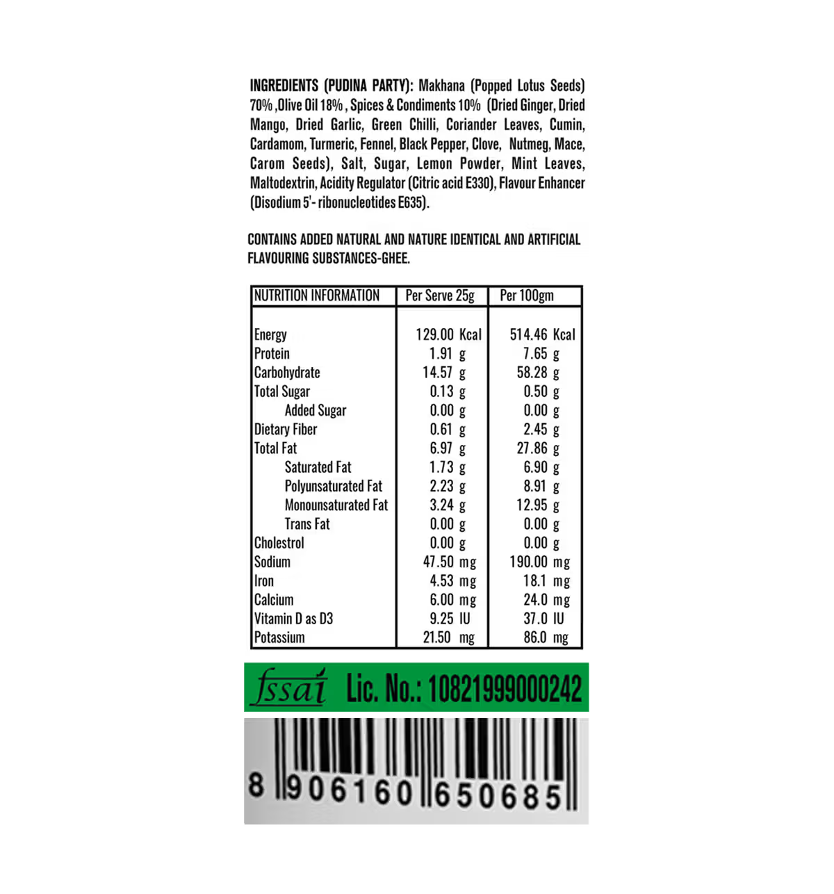 Makhana (Popped Lotus Seeds) 70%, Olive Oil 18%, Spices and Condiments 10% (Dried Ginger, Dried Mango, Dried Garlic, Green Chilli, Coriander Leaves, Cumin, Cardamom, Turmeric, Fennel, Black Pepper, Clove, Nutmeg, Mace, Carom Seeds), Salt, Sugar, Lemon Powder, Mint Leaves, Maltodextrin, Acidity Regulator (Citric acid E330), Flavour Enhancer (Disodium 5'-ribonucleotides E635)