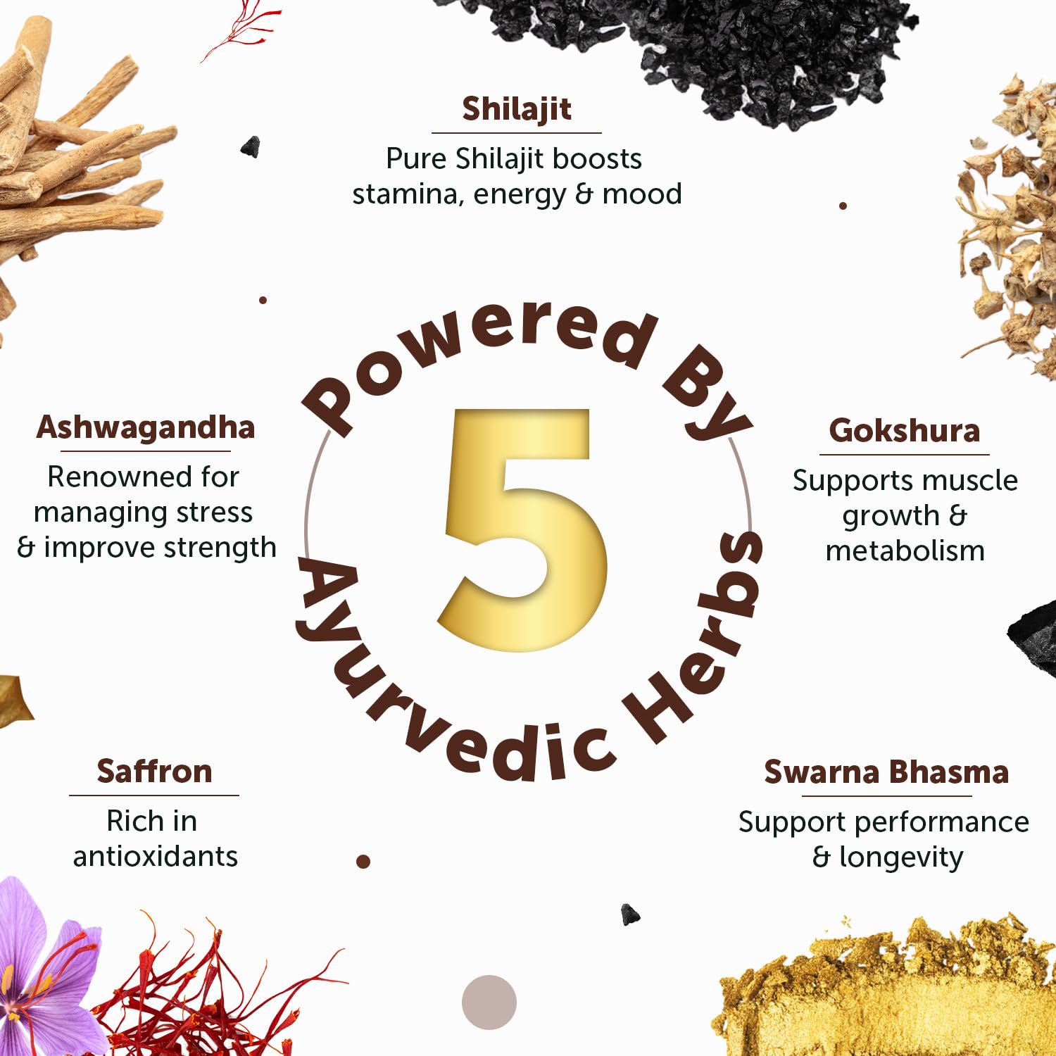 Gold Shilajeet Supplement With Ashwagandha, Gokshura, Saffron, Swarna bhasma & Trikatu | Boost Energy, Stamina & Strength | Lab Tested For Heavy Metal