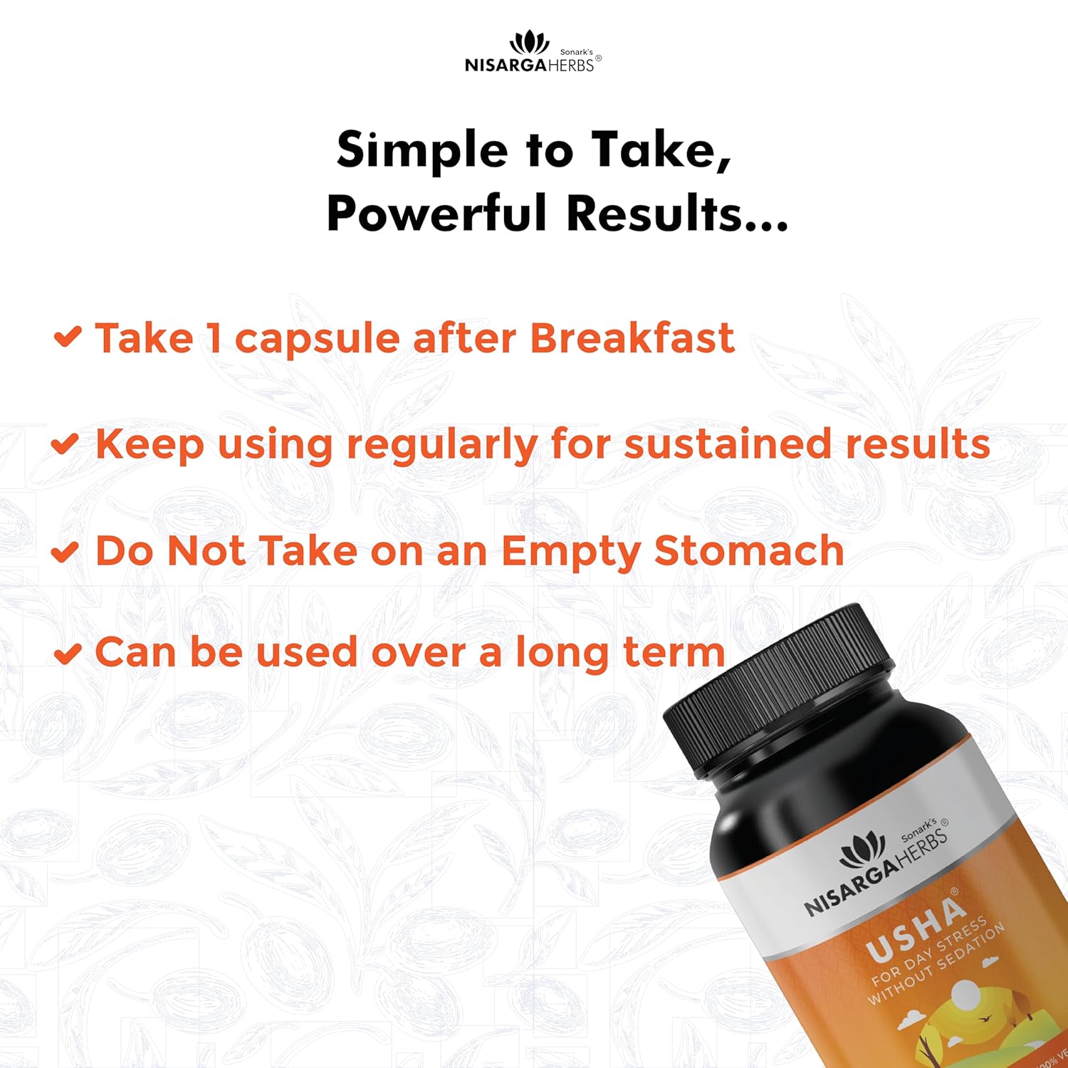 - BENEFITS: ‘Usha’ can help you manage your for stress levels. Made using time-tested and proven herbs, it rejuvenates both the mind and body. It has been especially formulated keeping in mind the over worked, over stressed individual - helping greatly in calming the senses and boosting energy levels... all day long!