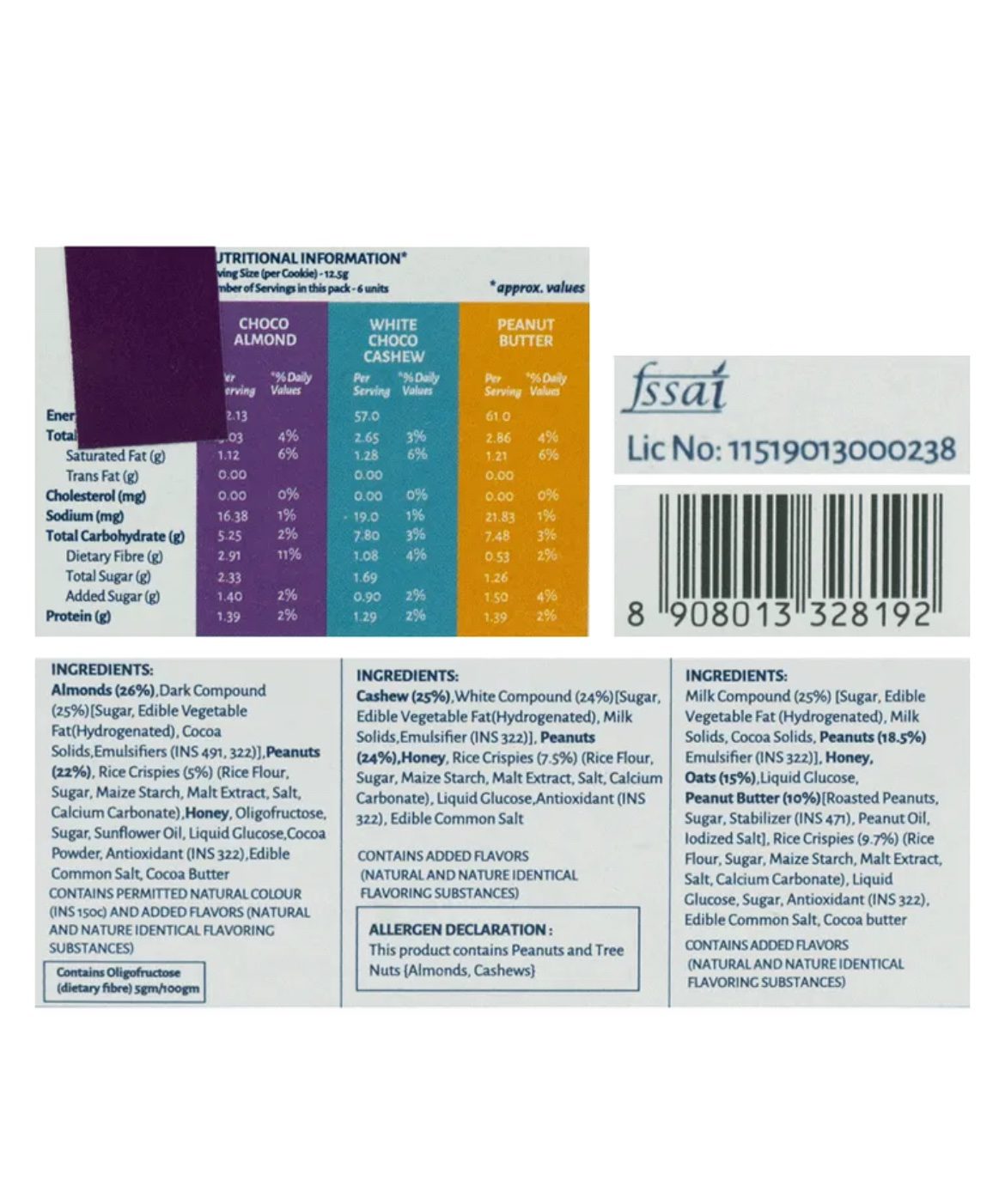- Choco-Almond Cookies: Almonds (26%), Dark Compound (25%), Peanuts (22%), Rice (5%)