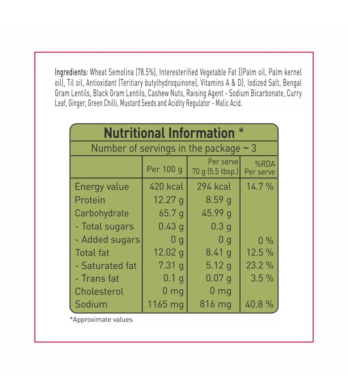 Ready‑mix to make soft, spongy rava idlis. Just add water (and/or curd as per pack instructions), mix, steam—idlis are ready in minutes