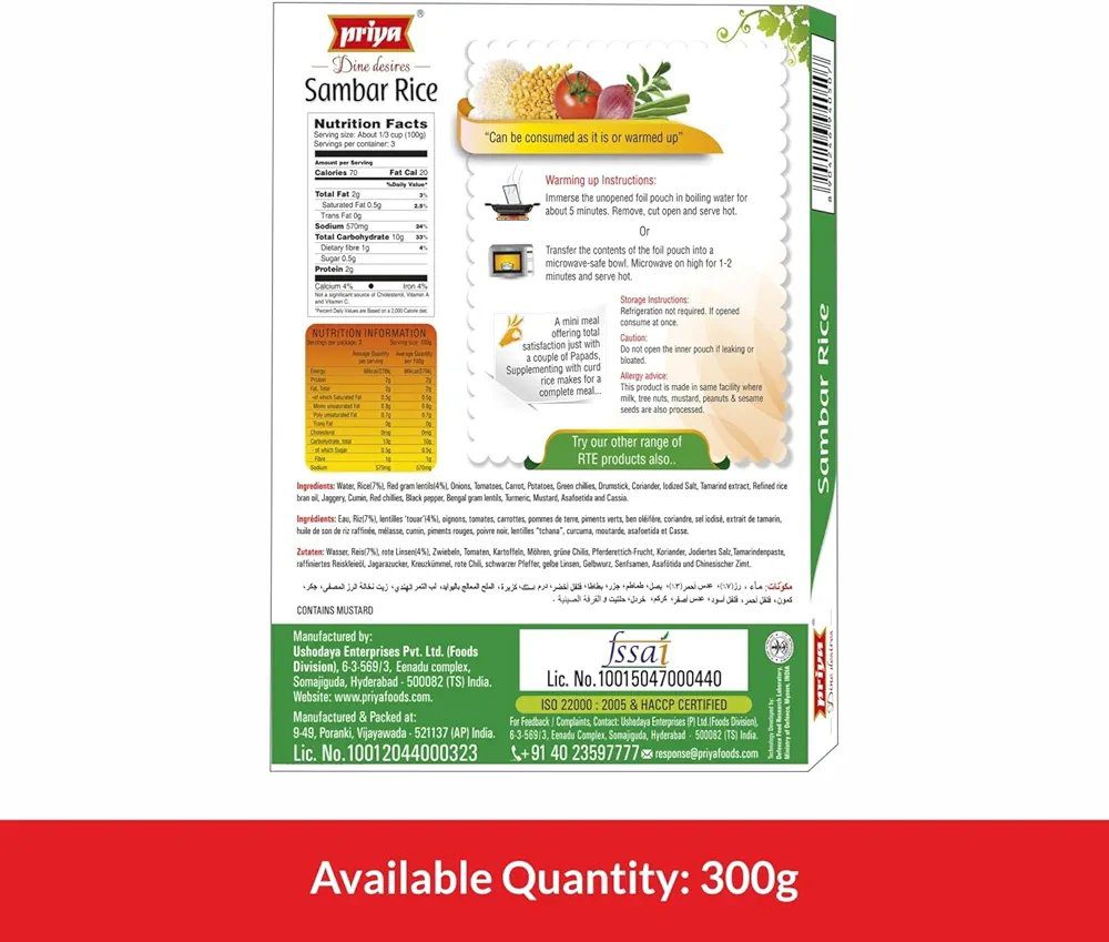 Priya Ready To Eat Sambar Rice 300g (Pack of 2) I Total 600gm