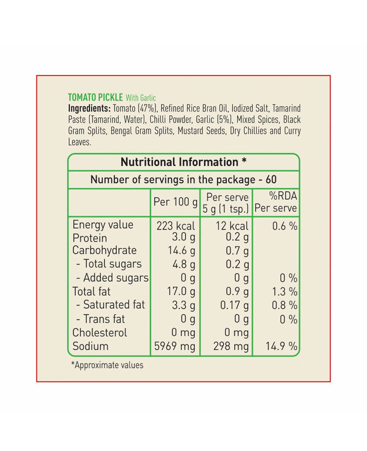 Complete every meal at home or at the office with this delicious tomato achaar with garlic from the legendary brand Priya Foods, and get transported back to your childhood. This recipe has the distinctive taste of Andhra/Telugu‑style homemade pickles.