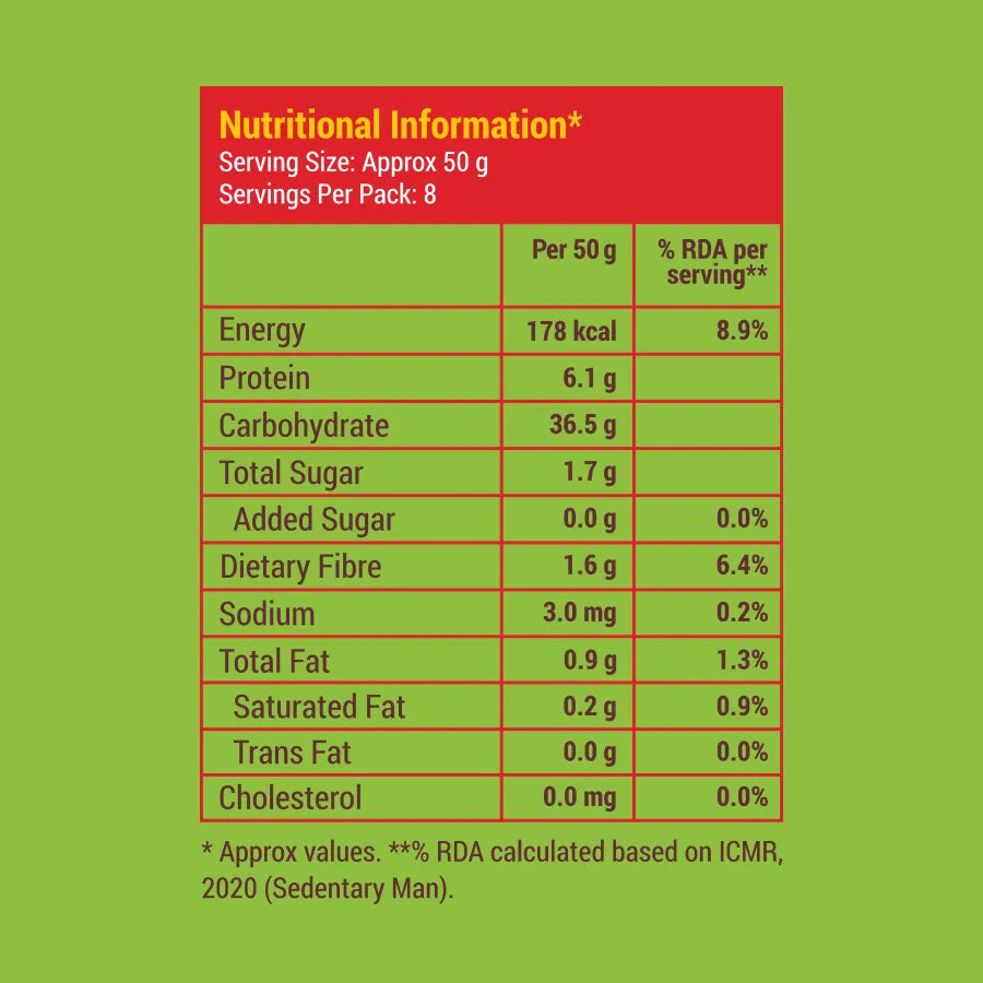 Energy (kcal) 178.0 (RDA 8.9%), Protein (g) 6.1, Carbohydrate (g) 36.5, Total Sugar (g) 1.7, Added Sugar (g) 0.0, Dietary Fibre (g) 1.6 (RDA 6.4%), Sodium (mg) 3.0 (RDA 0.2%), Total Fat (g) 0.9 (RDA 1.3%), Saturated Fat (g) 0.2 (RDA 0.9%), Trans Fat (g) 0.0, Cholesterol (mg) 0.0
