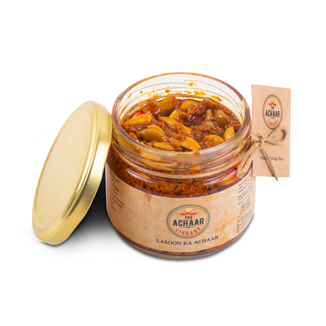 A pungent and spicy homemade garlic pickle, perfect for garlic lovers seeking a zesty kick to their meals.