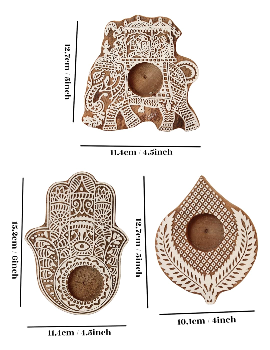 - Packages Include :- Set of 3 Wooden Handmade Tealight Candle Holder (Tea Lights Included), Material : Wooden, Size : (Hand - 15.2 cm x 11.4 cm/ Elephant - 12.7 cm x 11.4 cm/ Leaf - 12.7 cm x 10.1 cm), Color : Multi