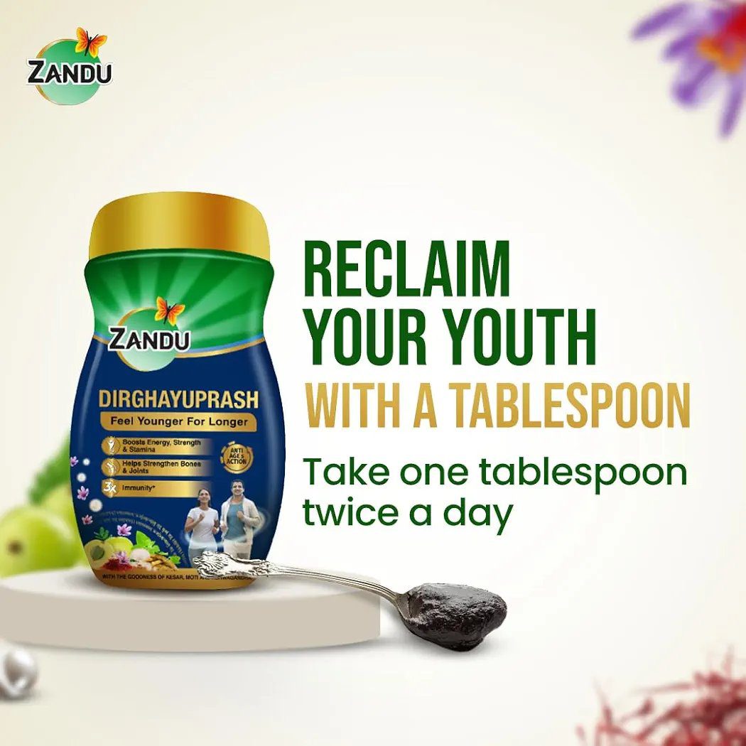 Zandu Dirghayuprash: Anti Age Action* with Vayasthapan Mahakashaya Herbs, goodness of Chyawanprash for 3 way immunity action*| Boosts Energy, Strength, Stamina | Helps Strengthens Bones & Joints| Scientifically Proven | 900 GM