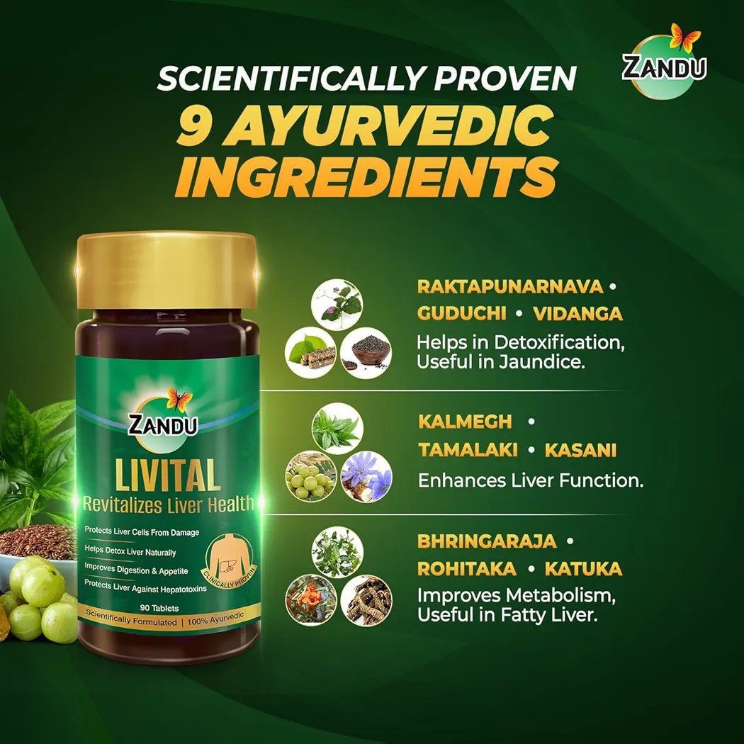Detoxify your liver naturally and protect it from toxins and the damage they cause within 2 months with Zandu Livital Tablets. Unlike general liver medicines, these Ayurvedic Liver tablets are free from chemicals or preservatives.